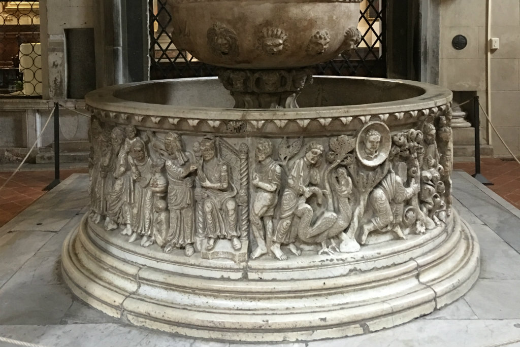 We were in Lucca when we discovered the Basilica of San Frediano. There are a number of fascinating things to see in this church, including the mummified remains(!) of Saint Zita. But what really caught my eye was the baptismal font. Sculpted with scenes from the Exodus, the prophets, the Good Shepherd, and the apostles, it is easily the largest baptismal font I have ever seen.