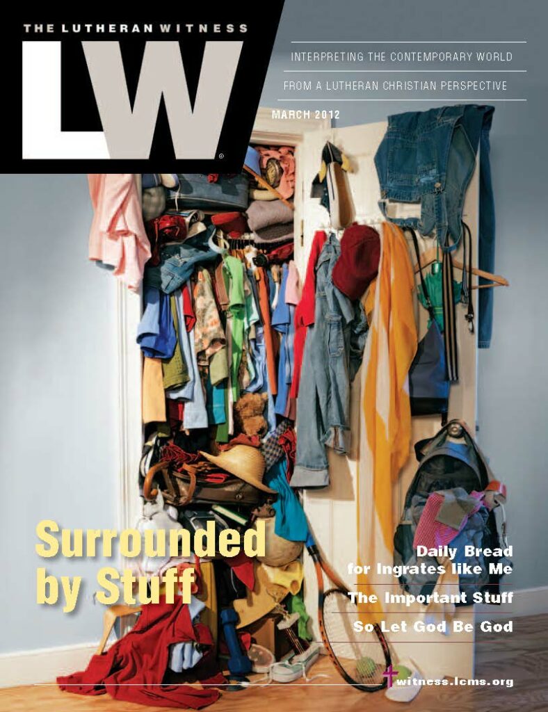 In March’s issue of The Lutheran Witness, we turn our focus away from earthly things, from stuff, and look instead to heavenly things, to matters of faith. Read the Rev. Ralph Tausz’s “Surrounded by Stuff,” which unpacks our desire to find happiness in what is physical and material rather than that which is eternal. Learn with the Rev. Tim Pauls what that little phrase “daily bread” means in “Daily Bread for Ingrates like Me.” Take on the task of teaching your children to seek first the kingdom of God, not clutter, in the Rev. Kurt Ulmer’s “The Important Stuff.” Take comfort in knowing that God has already fulfilled of all your needs—both physical and spiritual—in “So Let God Be God” by the Rev. Barry Long.